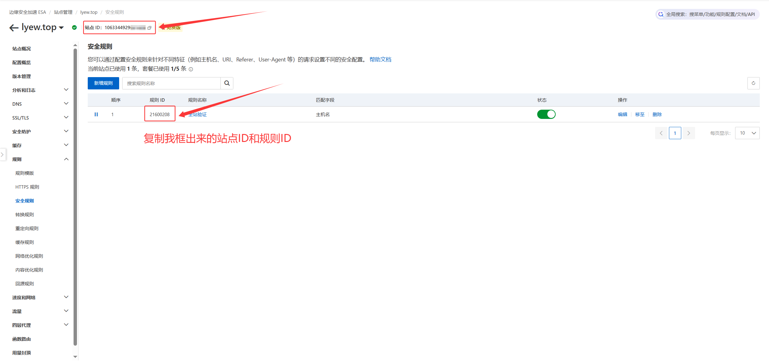 复制页面中的站点ID和规则ID,随便找个地方记一下,一会要用到。