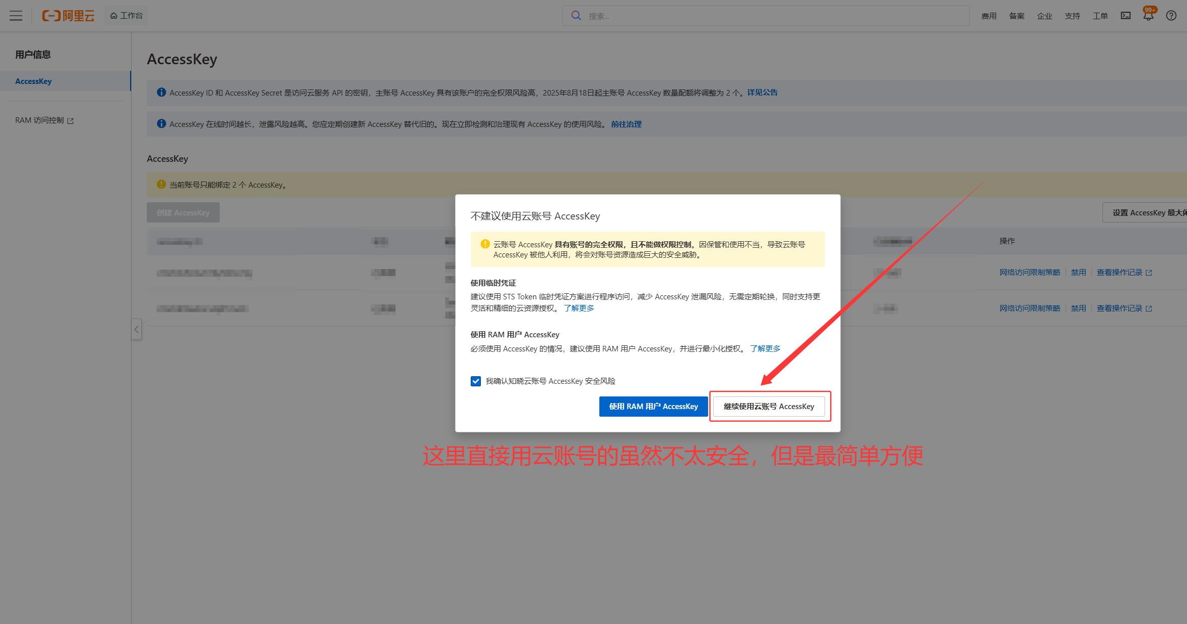 下一步我们需要获得AccessKey,注意,这个是非常敏感的信息,一定不能泄露!