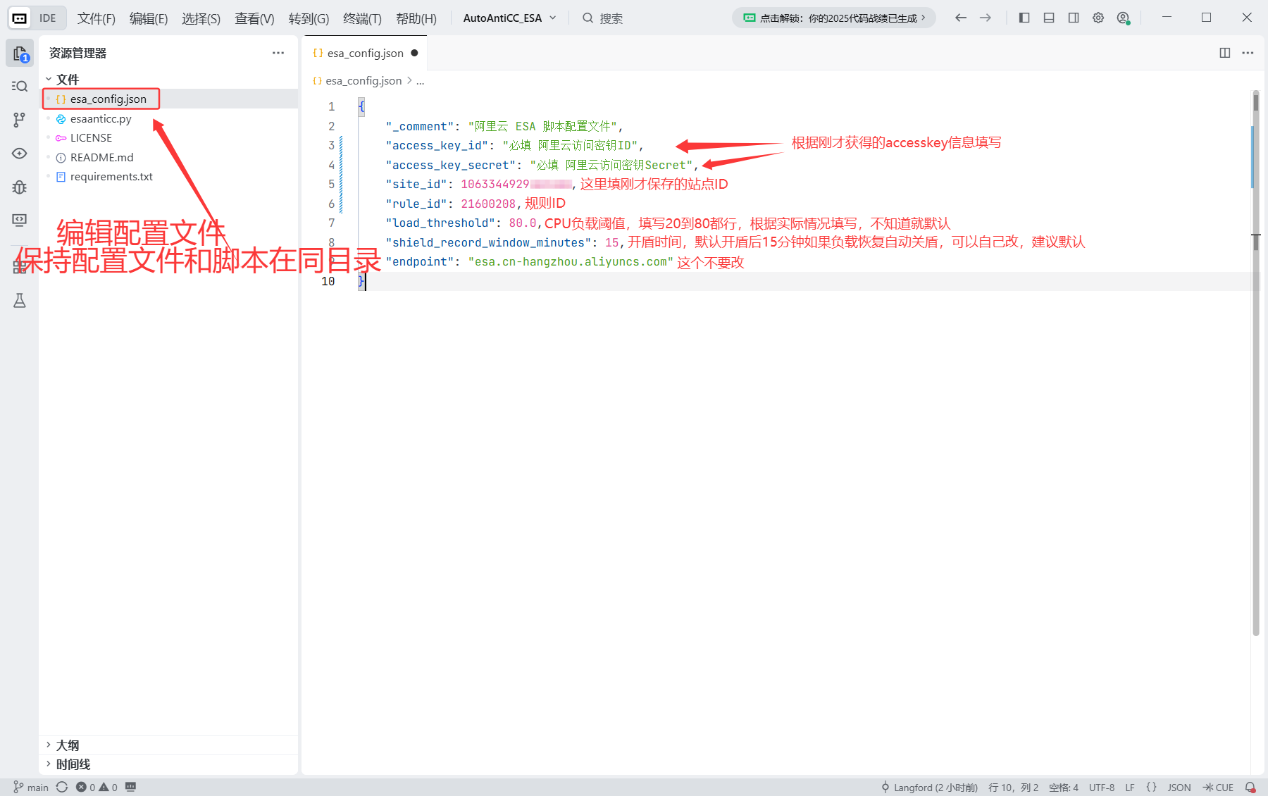 下载好脚本之后,把刚刚在电脑上修改好的esa_config.json文件,替换到服务器的esa_config.json中。